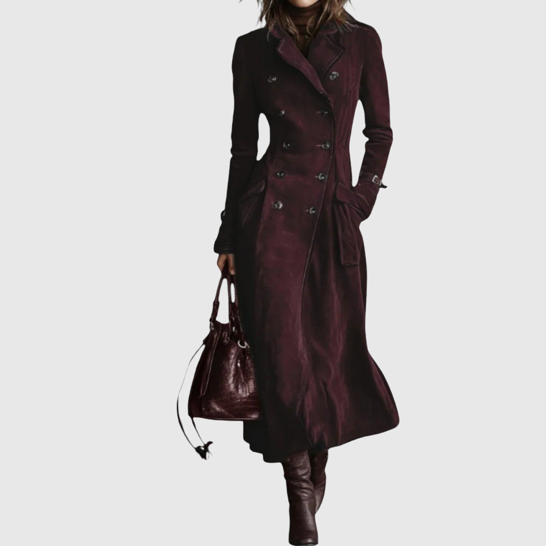 A study in timeless refinement, this long caramel-colored coat captivates with its sculpted silhouette and rich suede-effect texture. The double-breasted design and sartorial stitching create a sense of controlled strength, softened by fluid movement. Its warm, earthy tone evokes the charm of autumn and quiet confidence, blending vintage inspiration with contemporary appeal. Perfect for crisp urban mornings or refined weekend getaways, it elevates every outfit with understated elegance.