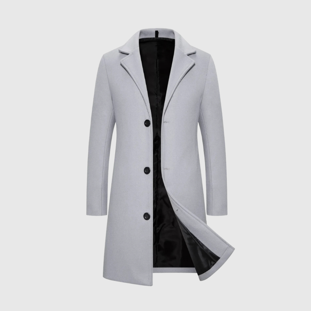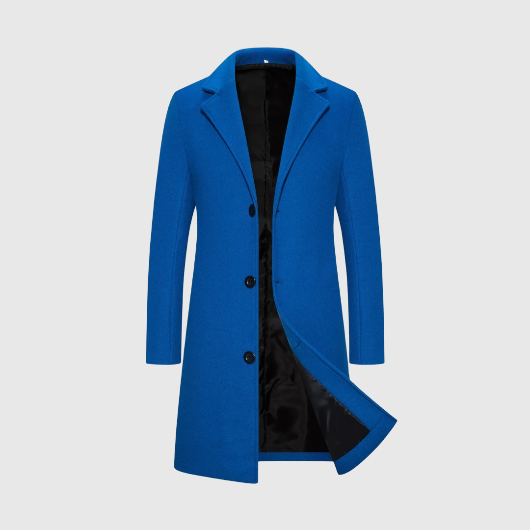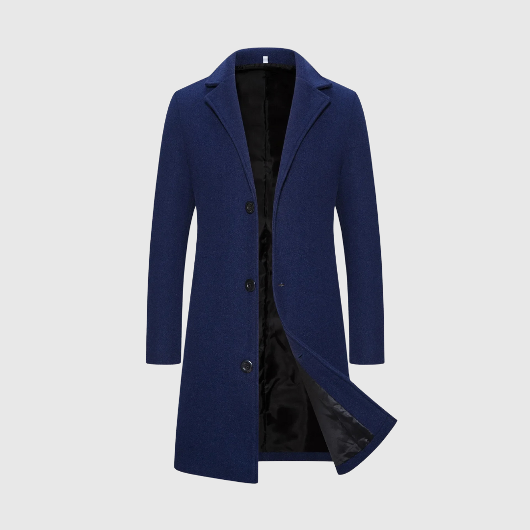 The three-button closure and pointed lapels give it a timeless appeal. The extended length offers protection from the elements while maintaining a clean, modern line. Designed to transition seamlessly from commutes and client meetings to weekend wear.